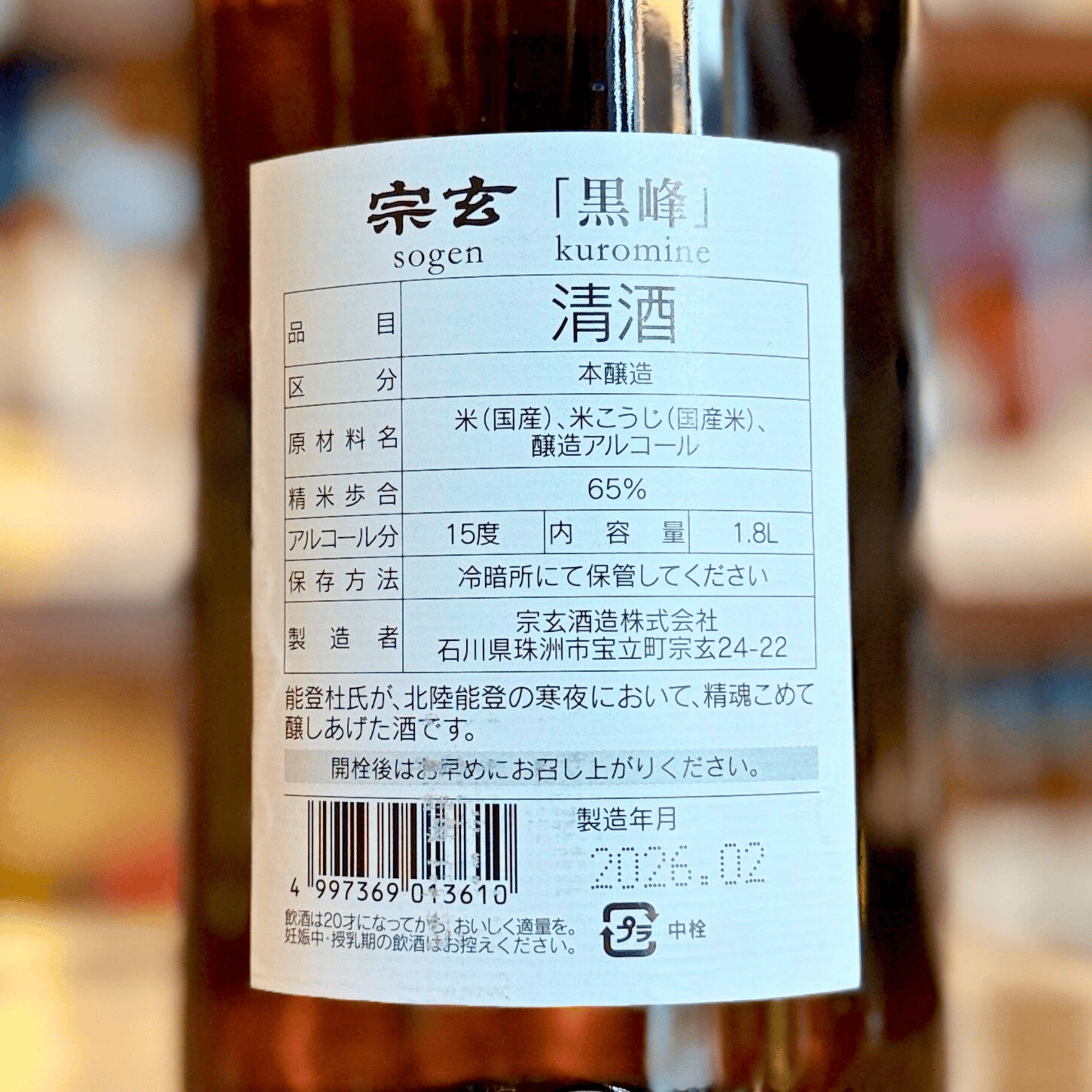 宗玄 本醸造 黒峰 【数量限定】石川県 奥能登